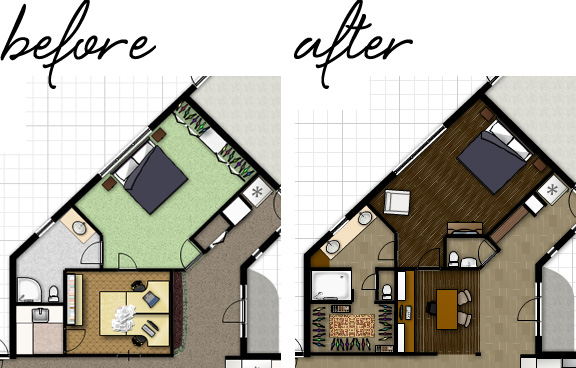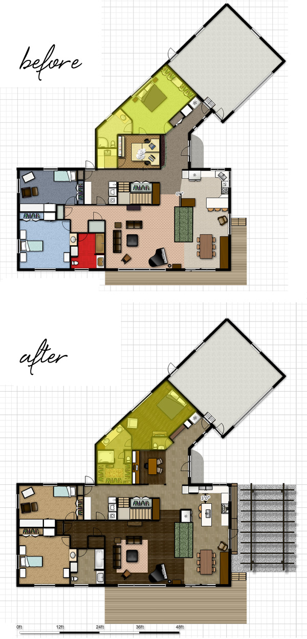 As you can see in the before plan, you can look right in to the Master bedroom from the front door of the house. I don't know about you, but I don't make my bed first thing every day, and I really don't need the UPS knowing that. So that leads us to our first project: