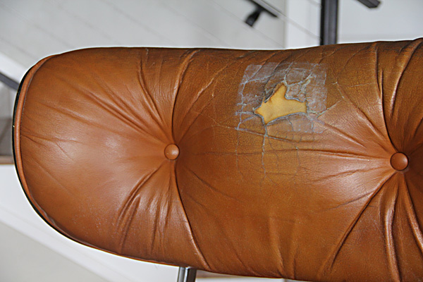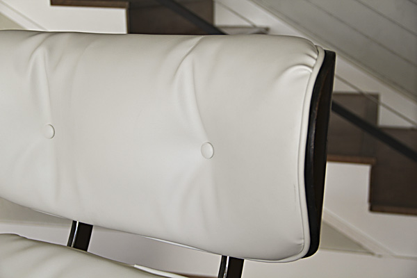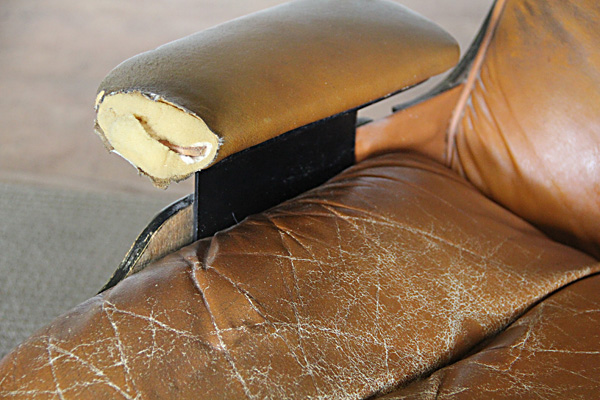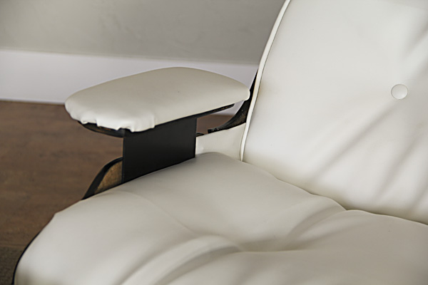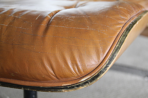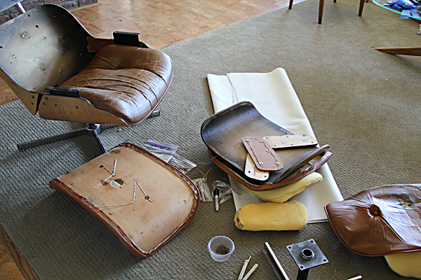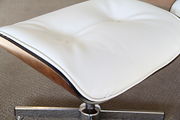 Had this been an original Eames lounge and not a knock-off, I would have been inclined to use real leather. As it was, the only $$ I had into this project were for a few small supplies: buttons, welting, needles, and upholstery thread. The chair was free (my Grandpa's chair, cast off to the back recesses of the storage room in our house), and the vinyl was something my mom and dad had on hand and donated for the cause.