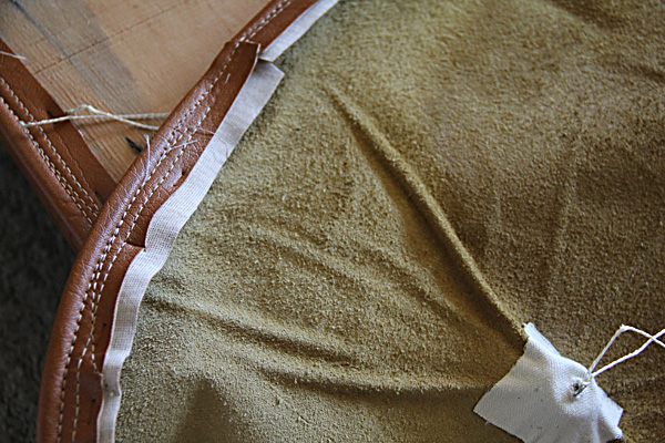 I must say this was no small challenge for me. It took time to disassemble, remove hundreds of staples, and carefully label and bag each piece of hardware. I took photos along the way to help me with reassembly—something I was glad for when I finally got around to it 6 months later. It was another time investment to refinish (sanding very carefully so as not to damage the thin veneer, then applying the stain and 3 coats of Poly acrylic finish, sanding between every coat). I spent another long day sewing hoping so much to finish it in one day. That night I gave up in frustration, feeling like I would never get it right. (I am, after all, a complete novice in re-upholstery). I spent a little time researching other redos online and discovered I might have been the only person crazy enough to attempt sewing the welting directly to the cushions before attaching them to the wood. Most people stapled their cushion fabric, then glued or stapled the welting separately. Easier, for sure, but my way was the way it was constructed originally. The problem was that the old leather was stretched out and made an imperfect pattern. Easing and gathering the stiff vinyl around the edges was really challenging. The result is very imperfect and there are plenty of puckers, but I think in the long run the construction will be stronger.