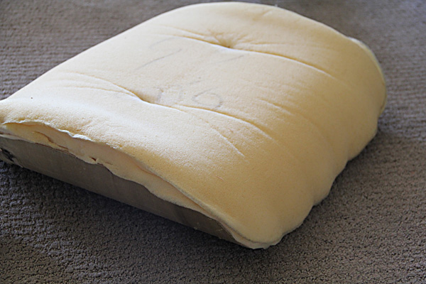 The back of the ottoman with the outer shell removed, showing how the cushions were stapled onto the fabric: