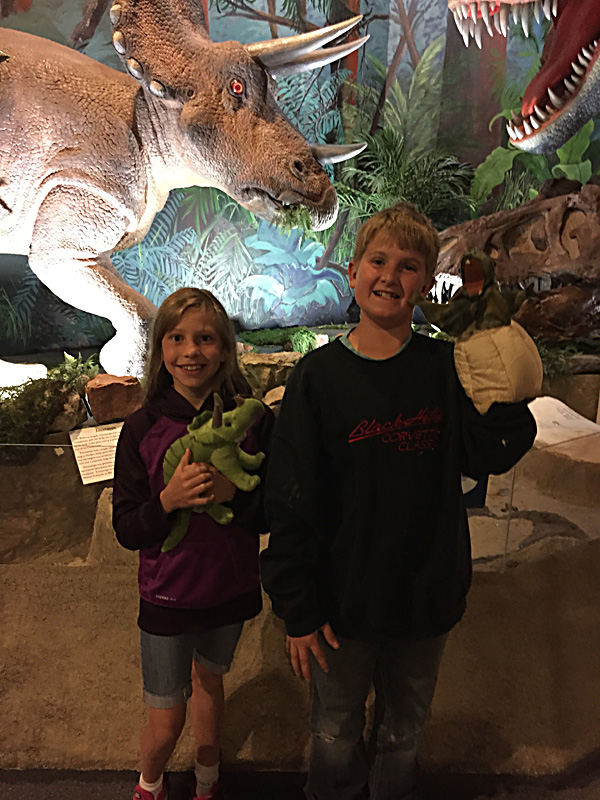 The Museum kept the kids entertained for the morning with the usual dinosaur paraphernalia. The Black Hills are a pretty interesting geological formation so we enjoyed learning about that also. I also enjoyed the exhibit about a 1972 flood when the dam broke on Lake Pactola, flooding campgrounds all the way down the mountain and Rapid City. It was a bit disconcerting knowing there were flood warnings out throughout the day for all the creeks in the Hills due to heavy rain.