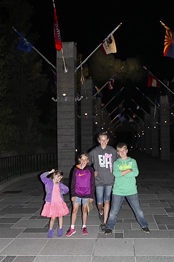 Our mission for the evening was to end up at Mount Rushmore to check that stop off our list. But for a twist we decided to visit it at night. We met up with Tom's parents and nephew in nearby Keystone for dinner, and then they joined us at Mount Rushmore just in time to see the lighting ceremony. They show a film about the presidents honored and then they honor all the veterans present. It was a neat time to visit, if not the most ideal for photos. :)