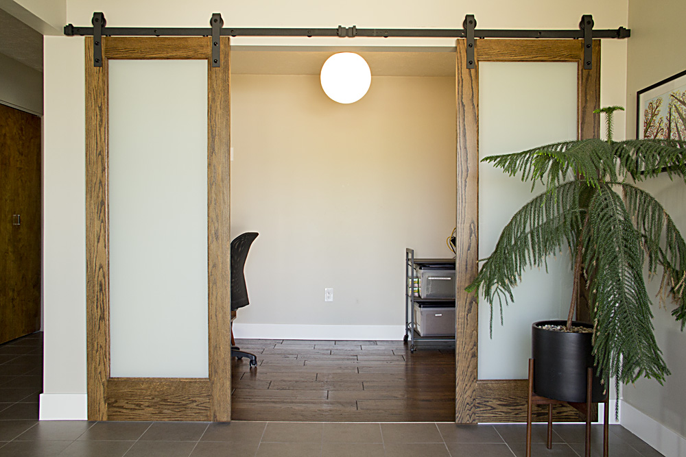 We opted to put frosted glass sliding doors in so we could fully close the office off and still let daylight in. The barn door hardware and doors are from Home Depot, and considerably less expensive than most others on the market, but I'm happy to say we were pleased with the quality.