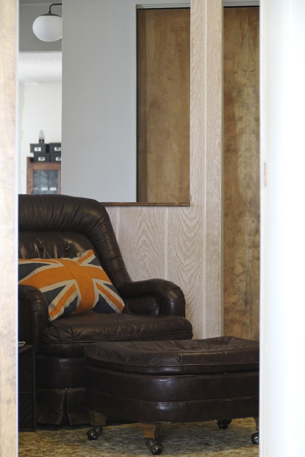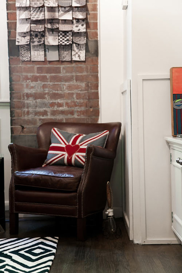 Why does it grab me? Because of the dark leather chair and black & white photos contrasted against the rough brick. But mostly because of the graphic punch of that Union Jack Pillow. I'm not sure when I started wanting to own a Union Jack Pillow... from this image or way before, but I've had my eye out for one for a long time.