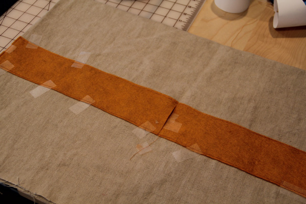 To applique the felt to the pillow, I used scotch tape to hold it in place because I figured it would hold flatter than pins. I sewed right over the scotch tape and removed it afterwards. If I had it to do over again, I would try an iron-on adhesive to attach the pieces before sewing.