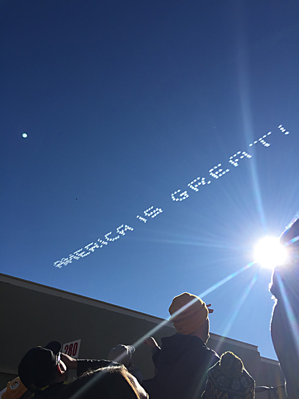 In case you've never seen this before or missed the news coverage, it is done by a series of 5 planes that fly in formation and release gases to form letters in a dot pattern. They started out with "America is Great" and we all cheered. The guy behind us remarked "I bet this is Trump's doing". Sure enough, the next word was "Trump" and we all laughed. But then it continued to say "Trump is Disgusting" and followed with a number of phrases slamming Trump that I won't repeat. Definitely not Trump's doing! Someone found an effective way to get their message across, anyway.  Adding to that, the Rose Bowl Parade was followed by a large number of Bernie supporters in their own parade of support. Ah yes, it is indeed an election year.