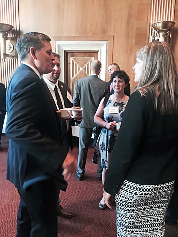 I should have prepared better for this event by eating breakfast before, but naturally I assumed that breakfast with our delegation meant we would be eating there. Moments before this photo was taken with Senator Daines (left), I was unsuccessfully juggling my coffee and muffin on a plate, and managed to drop my muffin on the floor right at the Senator's feet. Classy. Without missing a beat he bent down and picked up for me and set it aside. Yes.