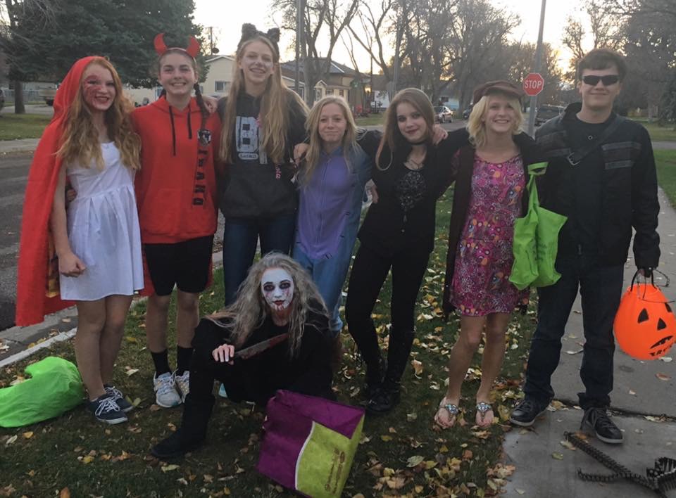 So what about Abby? In the teenager way she donned an impromptu costume and took off to trick-or-treat with her friends. Thanks to my friend Scotti for nabbing this photo: