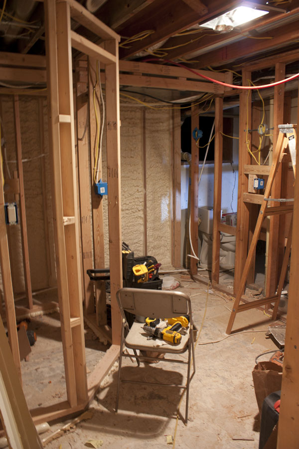 Construction is done on the office (except cabinetry) and bedroom. Stay tuned for more on that! We knew we would not have time to complete the whole bathroom this winter, so we opted not to demo it. Instead we finished all the walls on the bedroom and office side and hope to tackle the rest when winter comes again. In the meantime, I hope you will weigh in on my bathroom plan options! Am I crazy to insist on a separate space for the toilet?